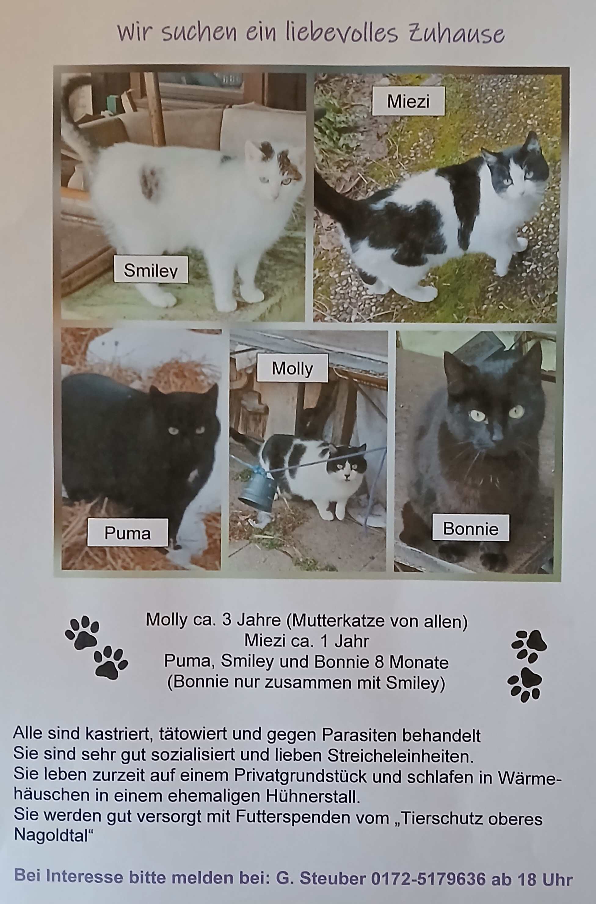7 Monate alt sind 9 Katzenkinder. Sie sind lieb, verspielt und menschenbezogen. Kastriert, gechipt und geimpft. Gern 2 zusammen oder als Zweitkatze. Wohnung. Weitere Infos.